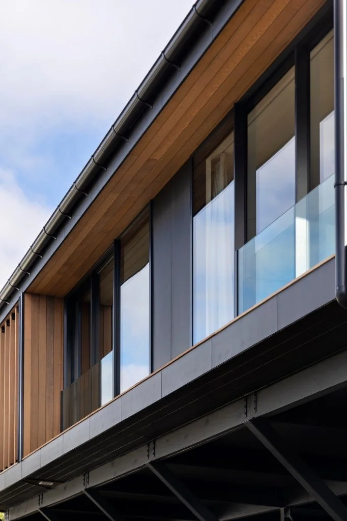 Timber is used in the internal spaces to create warmth contrasting with the steel highlights and white painted plasterboard. Sustainability is emphasised, with super-insulated walls, high-spec glazing and surface-mounted lighting used to minimise thermal envelope penetrations.