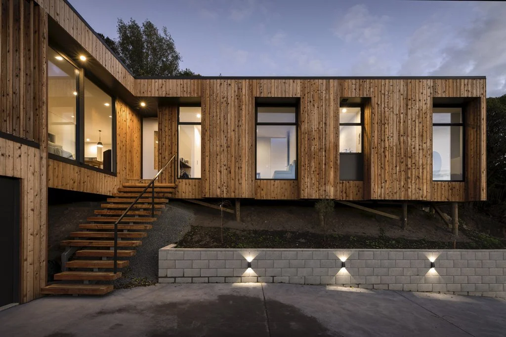 The floor plan cranks in an L-shape to shelter from prevailing winds, and views to Kaikoura in the north and across the city to the west are maximised. The house was designed and built to a strict budget and the result is a cost-effective hillside home that utilises space cleverly.