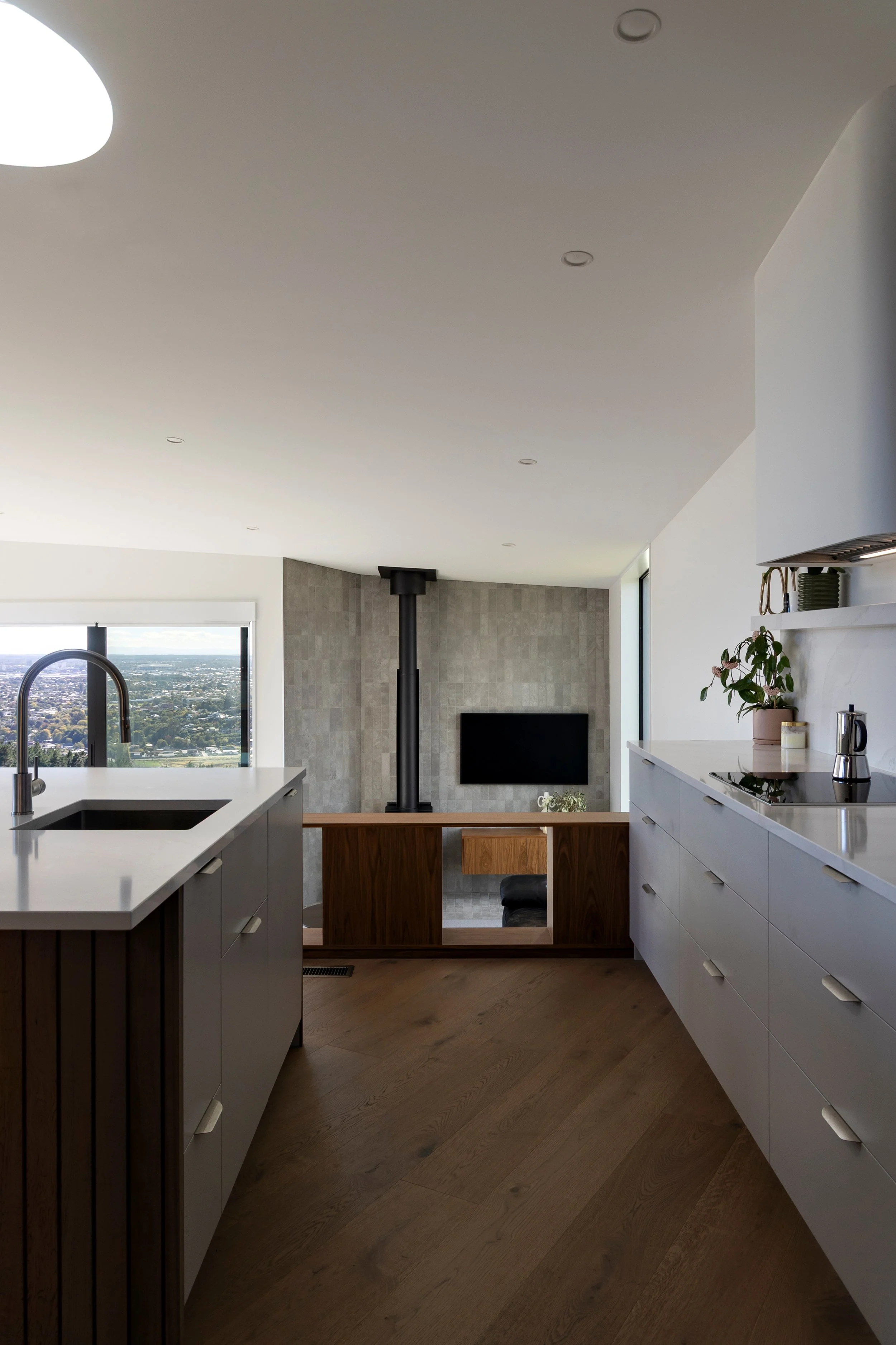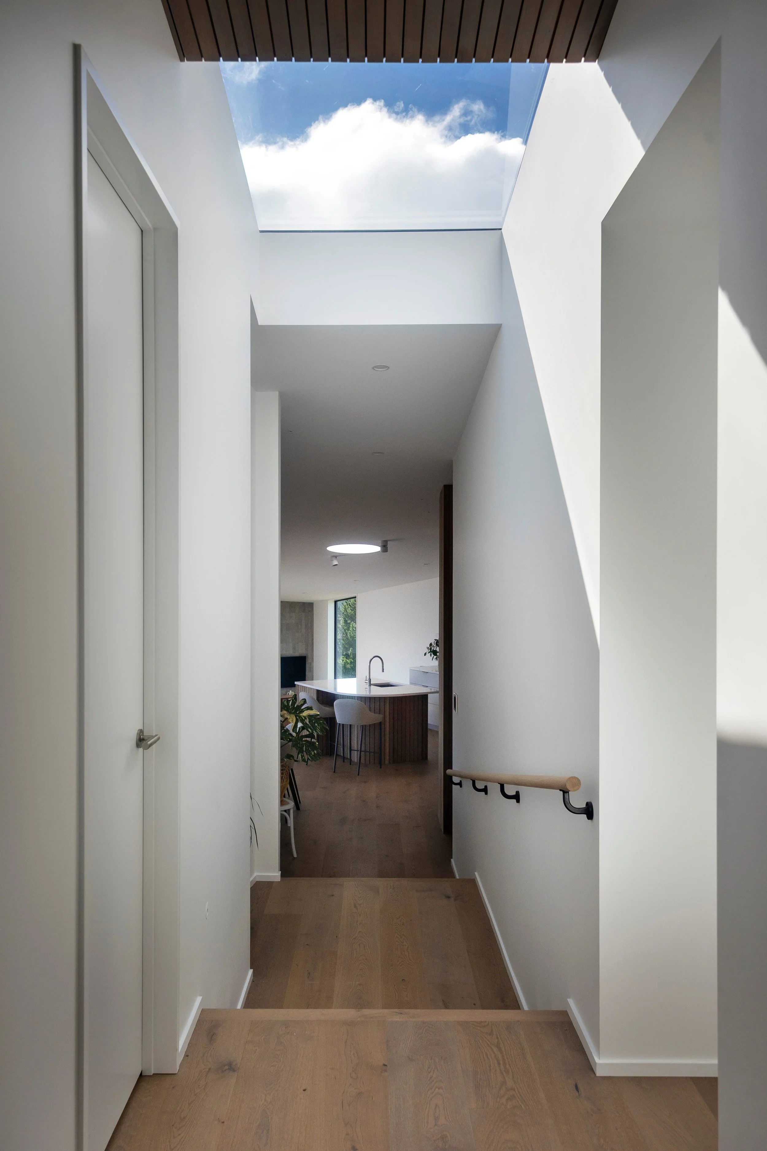 Anchored at the road, the house steps gently down the site, working with the natural topography. Internally, a sequence of split levels and a sunken lounge establish a sense of movement and progression. The entry leads into a long, transparent hallway, offering layered views through the building and reinforcing a strong connection to the landscape beyond.